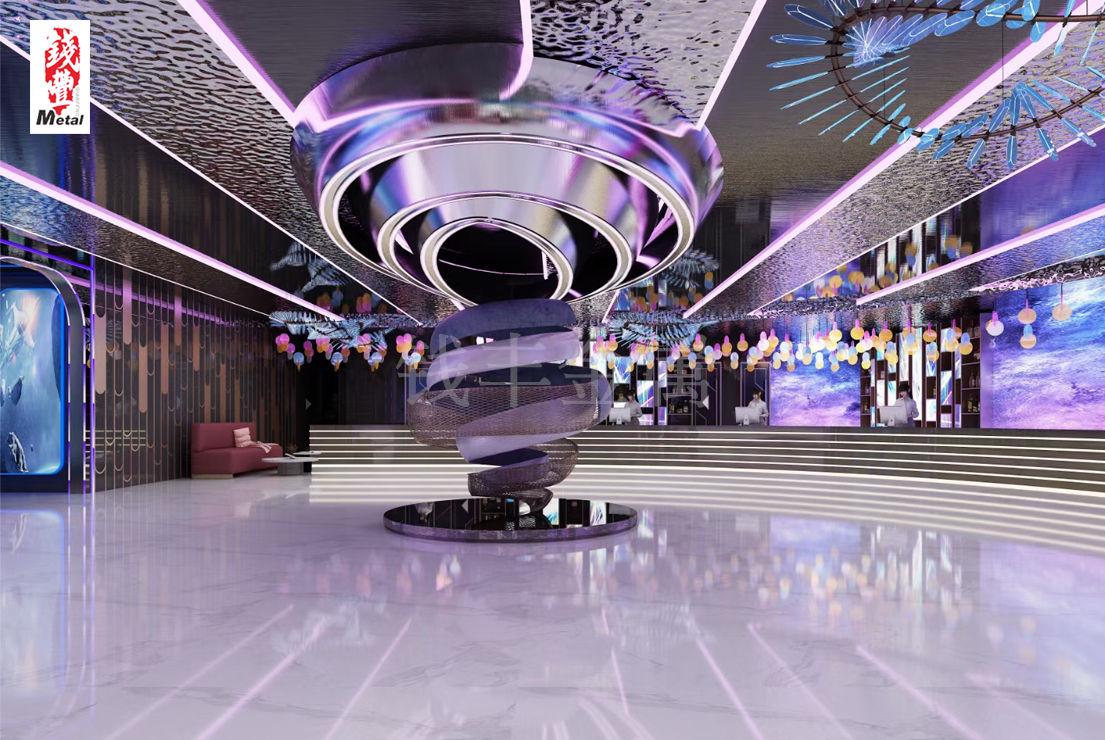 不銹鋼水波紋板具有其獨特的設計風格和優勢,為KTV的裝飾創造了更多可能性。首先,不銹鋼材質的選用保證了板材的耐久性和良好的防腐性能,使其能夠經受住長時間的使用和清潔,同時還能保持表面的光潔度,提供給消費者一個整潔舒適的環境。